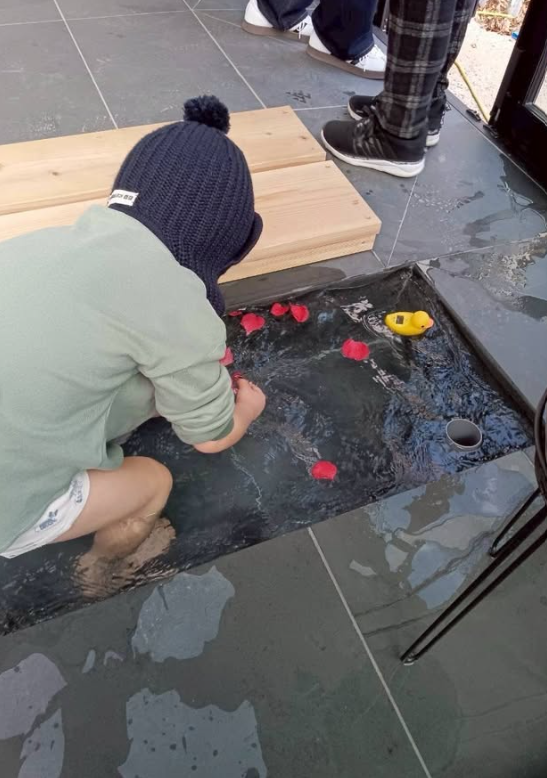色とりどりの花びらが浮かぶ足湯は、まさに“花を添える”ひととき。