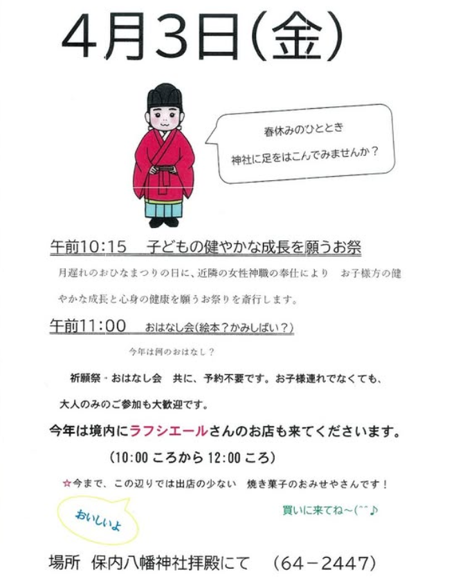 そんな保内八幡神社にて、子どもたちの健やかな成長を願うお祭りが4月3日(金)に開催されます!