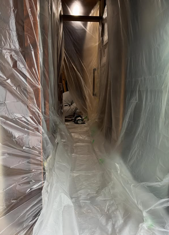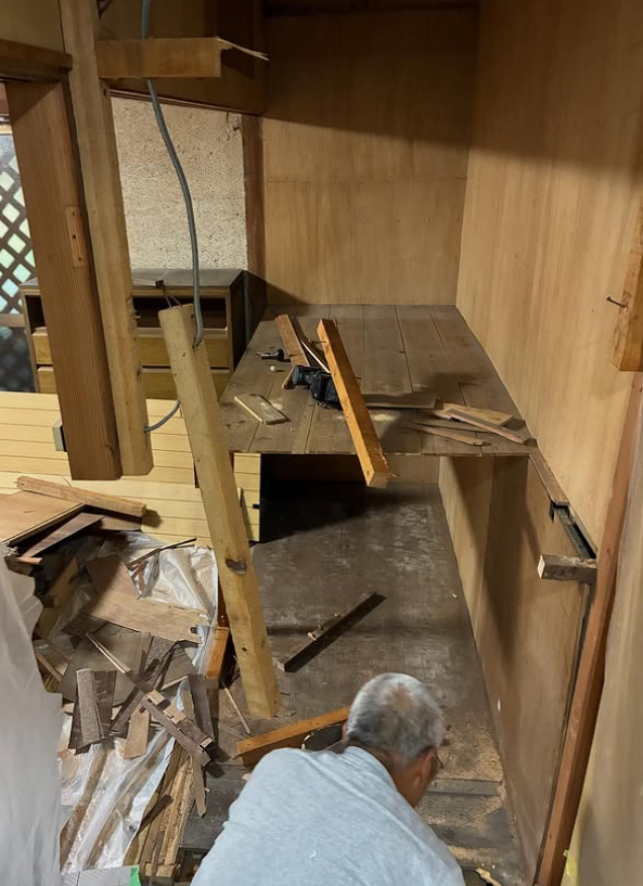 【養生の通り道】介護リノベ 2025/10/27 今治市での一コマ 新しく介護リノベの現場で 解体が始まりました 縁側を搬出の通り道にするため 足元と壁をビニールシートで 埃、汚れ防止 おばあちゃんが 一人でトイレに行けるように 改良していきます^_^ #情熱工務店 #無添加住宅 #介護リノベ #入り口広げる #引き戸に変更